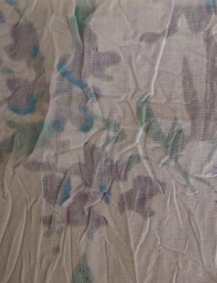 该面料是以100%涤纶长丝为原料,规格采用50D*50D,在喷水织机上织造而成。制成后的坯布首先通过褶皱使面料在柔中有了刚性的风格,然后再在雪纺皱上做过特殊处理后形成的图形,感觉与烂花布差不多,但比烂花布多一个优点,就是不会因为烂花而掉下纤维。制成后的面料手感好,轻盈,花型若隐若现,从而创造出雪纺面料的新风格,提高产品的附加值。该雪纺幅宽145—147CM,每平方米克重约80克。产品适宜制作女士裙装、围巾等。