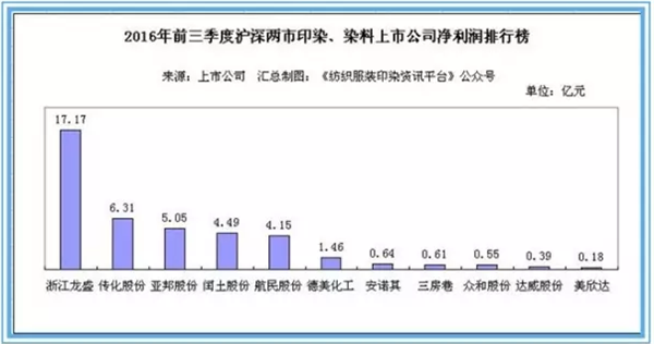 本土染料及染料中间体上市公司闰土股份,2016年1-9月份实现营业收入30.53亿元,与去年同期相比下降10.29%,实现营业利润5.37亿元,与去年同期相比下降32.24%,实现利润总额5.46亿元,与去年同期相比下降35.36%,归属于母公司股东的净利润4.41亿元,与去年同期相比下降35.18%。