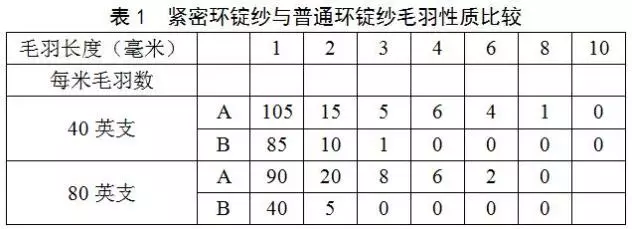 紧密纱的毛羽比普通环锭纱明显减少,见表1。