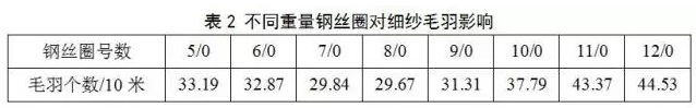 纺纱时钢丝圈太轻、太重都会影响纺纱张力的变化,钢丝圈太重,纺纱张力大,使钢丝圈对纱线的摩擦增加,纱线还会与纱管顶端产生摩擦,如钢丝圈太轻,纺纱张力太小,气圈过大造成纱线碰隔纱板,这些都会使毛羽增加。