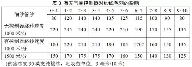 表3表明:不加装气圈控制器的络纱机络纱后比络纱前的细纱毛羽多2倍,而加装气圈控制器后络纱毛羽明显比无控制器少。加装控制器后即使络纱速度增加,毛羽也会减少。