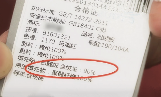 “通常羽绒服的标准,国标90%,所以它的含绒是必须在90%,最高能到95%左右”