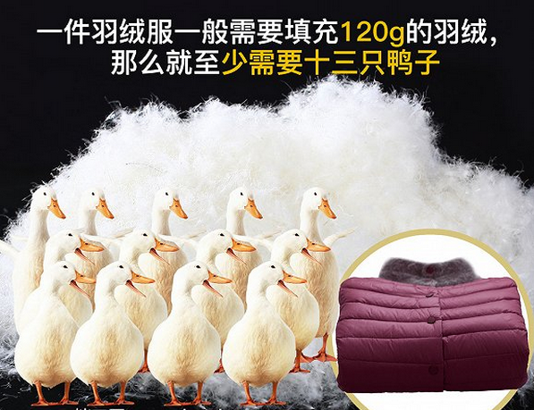 “按照国家标准,如果含绒量为90%的话,一件羽绒服一般需要填充120g的羽绒,那么就至少需要13只鸭子,而一条羽绒被至少需要160只鸭子才能做成一件1.5kg的羽绒被”