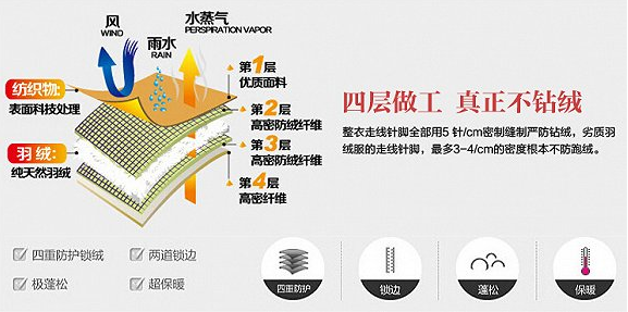 这是来源于近年来消费者的一个需求,因为消费者在冬天的时候,经常会遇到雨雪的天除了在面料上技术革新之外,在羽绒服的制作工艺上,今年的羽绒服企业也有了很大的提高,很多消费者在脱下羽绒服后经常会发现里面的衣服上会粘上一些羽绒或者绒丝,不但影响美观,而且很难清理。