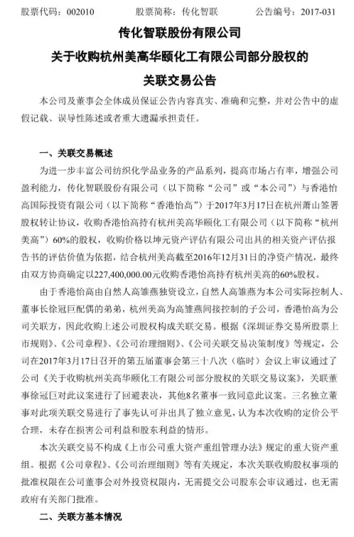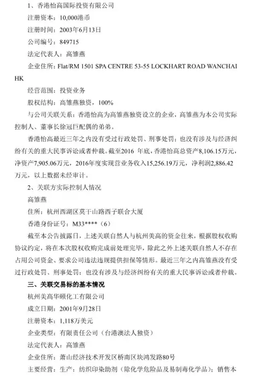 这是2017年染化料界的第一次收购,却是以关联交易开始的:美高控制人高雏燕是传化董事长徐冠巨配偶的弟弟!