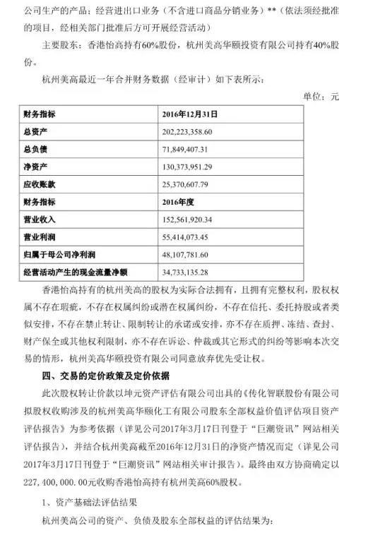 3月17日,传化与美高在杭州萧山签署股权转让协议,收购杭州美高60%的股权,收购价格2.274亿元。