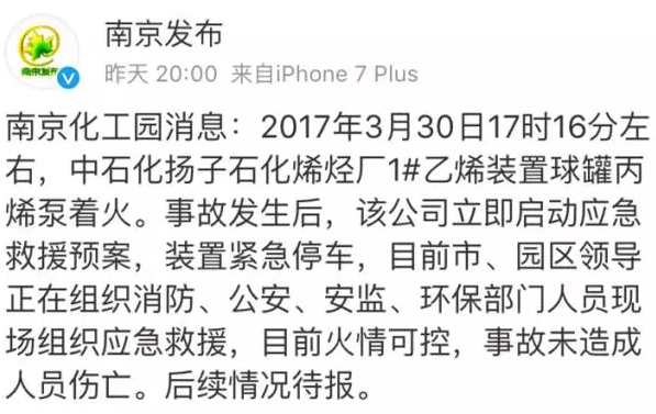 3月30日17时16分左右,南京扬子石化烯烃厂1#乙烯装置球罐丙烯中转泵泄露导致着火,装置紧急停车。据了解,现场火情可控,已于20时45分左右破灭,且未造成人员伤亡。