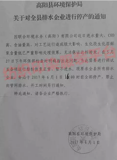 高阳县环境保护局关于对全线排水企业进行停产的通知