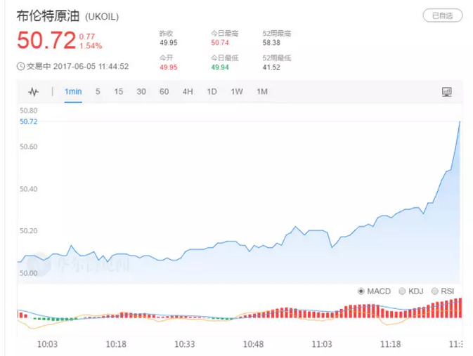 从国际油价走势来看,消息公布之初为小幅上涨,随后涨幅迅速扩大,布伦特原油现涨超1.5%,报50.72美元/桶。WTI原油涨近1.6%,报48.40美元/桶。