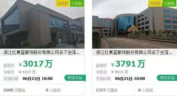 永嘉法院淘宝司法网拍平台显示,红黄蓝公司的两处厂房被挂在平台上进行司法拍卖,目前处于公告阶段,开拍时间都为今年6月21日上午10时。