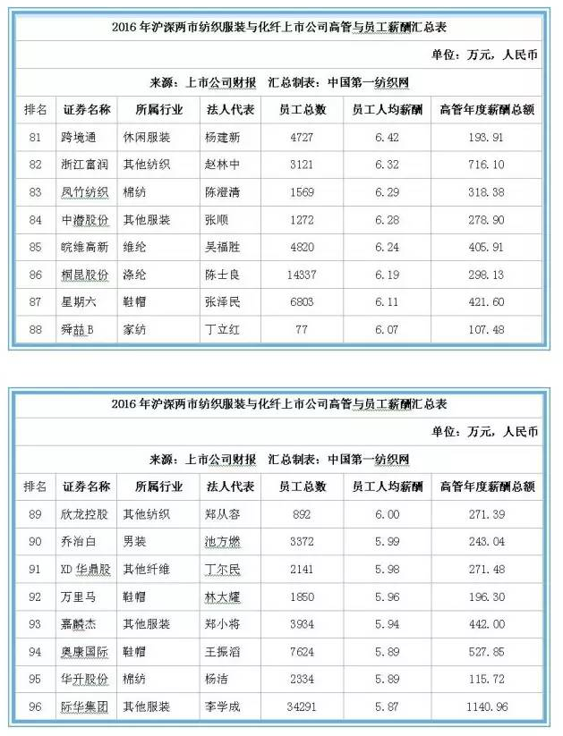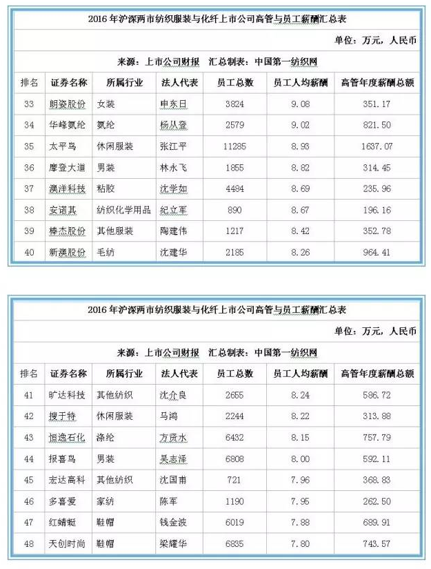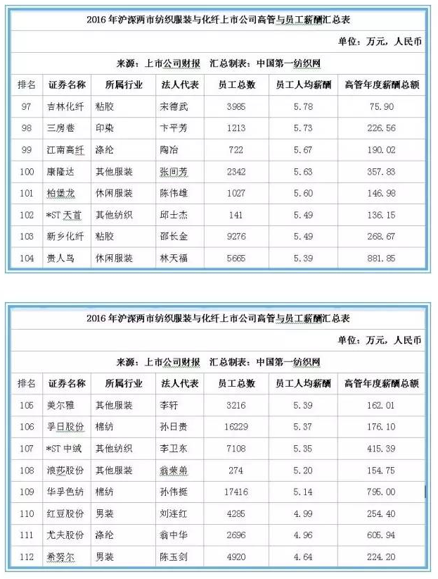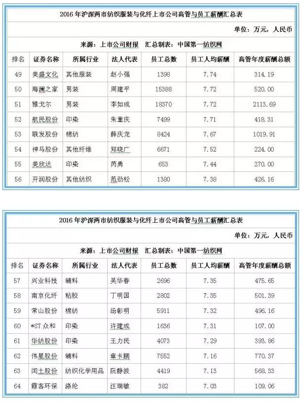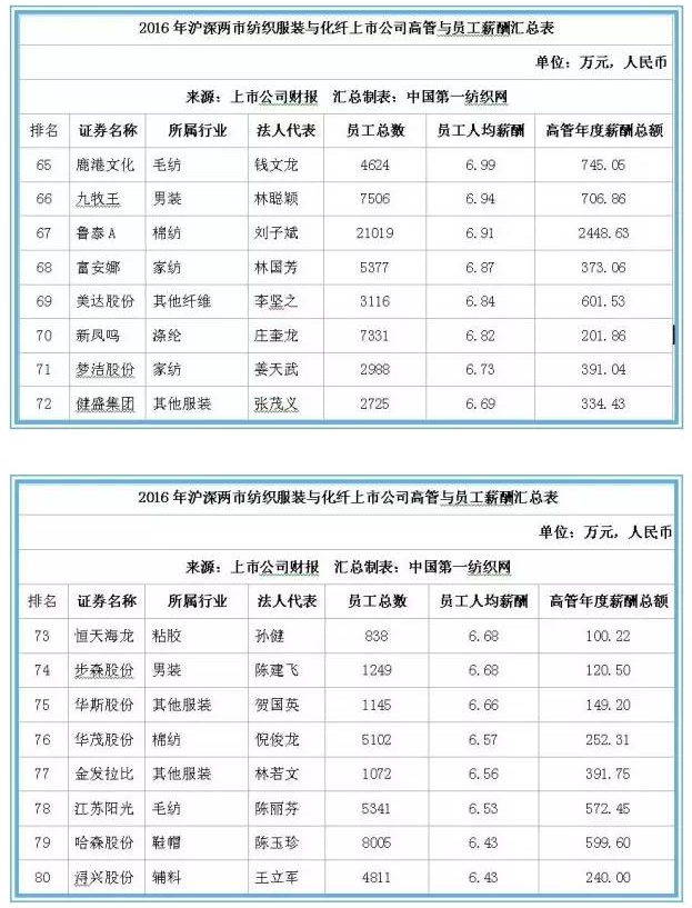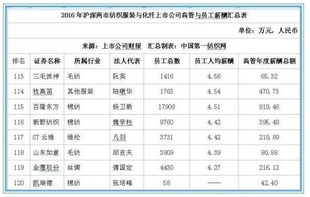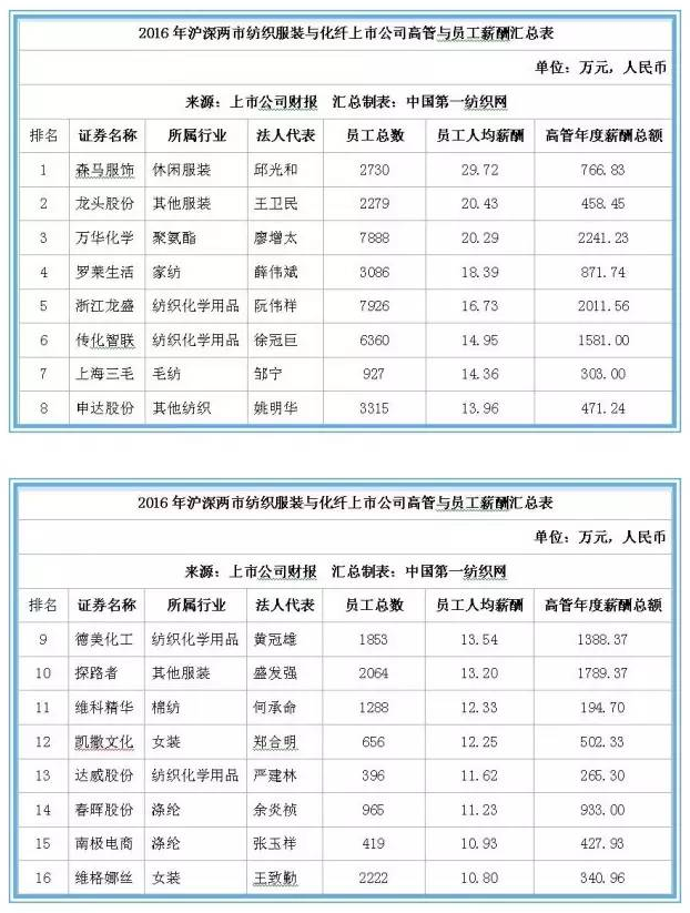 据中国网络监测数据显示,在沪深两市120家纺织服装上市公司中,在职职工人均薪酬方面:森马服饰领衔第一,2016年在职职工数量达2730人,人均薪酬达29.72万元;龙头股份紧随其二,2016年在职职工数量达2279人,人均薪酬20.43万元;万华化学为第三名,在职职工数量达7888人,人均薪酬20.29万元。
