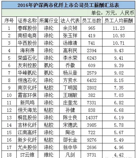 纺织化纤板块中,春晖股份、南极电商和华西股份居前三甲,所属行业均为涤纶。其中春晖股份以员工人均薪酬11.23万元人民币居首位!此外,海利得、荣盛石化、华峰氨纶等企业也在榜单前列!