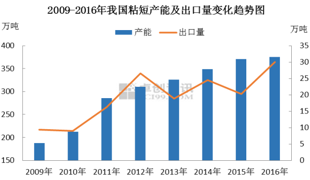 由图1可见,2009年至2016年,我国粘短产能及出口量整体均呈增量态势。产能年度平均增速为10.37%,出口量为18.18%。