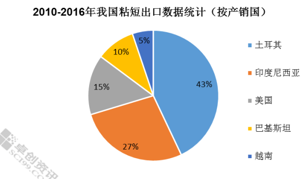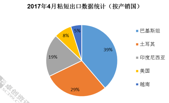 2010年至2016年,土耳其、印度尼西亚、巴基斯坦合计出口量占比为80%,2017年4月为87%。近年来,我国粘短出口格局较为稳定。