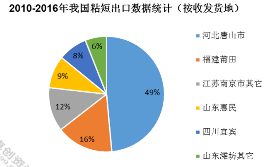 图4及图5,河北唐山地区粘短出口占比均约49%,占比约半成。福建莆田、江苏南京市其他地区等,占比分别为28%、12%。由此可见,后续我国粘短出口涉及高端及差别化粘短企业发展更具优势。