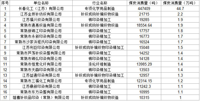常熟市2016年耗煤1万吨以上非电力生产企业一览表