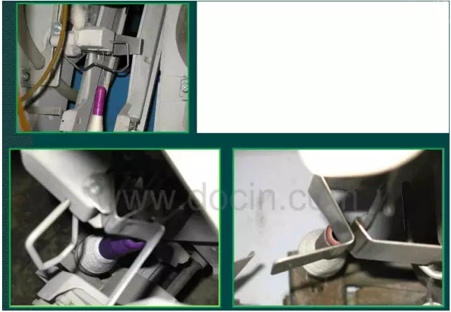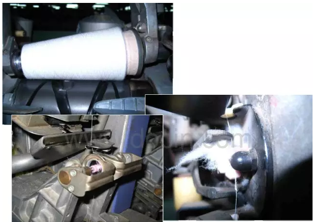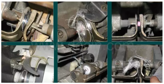 5、如图所示,筒纱夹头缠绕回丝,致使夹头运行受阻。