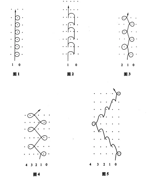 如闭口编链组织的走针轨迹为1-0,1一0,相应的垫纱运动如图1所示如开口编链组织的走针轨迹是1-0,0-1,对应的垫纱运动如图2所示经平组织的走针轨迹为1-0,1-2,垫纱运动如图3所示经绒组织的走针轨迹为1-0,2-3,垫纱运动如图4所示经缎组织的走针轨迹为1-0,1-2,2-3,3-4,4-5,4-3,3-2,2-1,垫纱运动如图5所示。