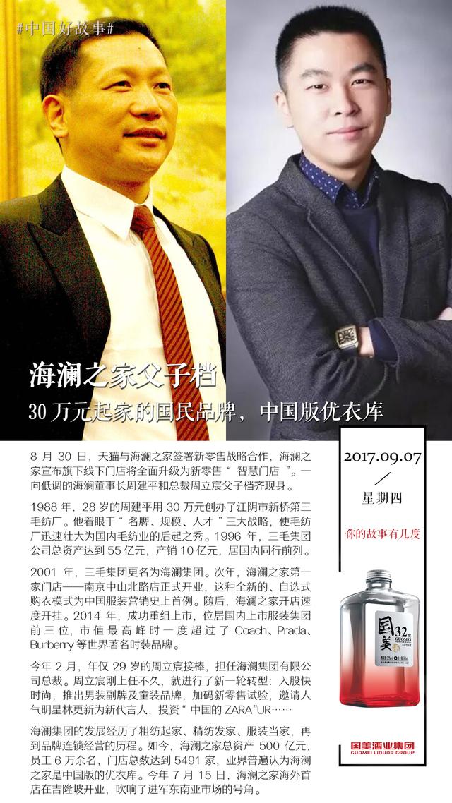 今年8月30日,天猫与海澜之家正式签署新零售战略合作,海澜之家宣布旗下5000家线下门店将全面升级为新零售“智慧门店”。一向低调的海澜董事长周建平和总裁周立宸父子档齐现身。