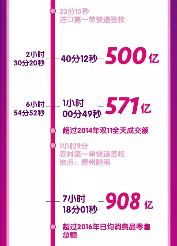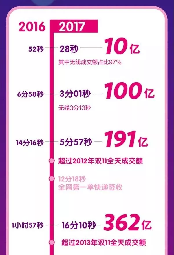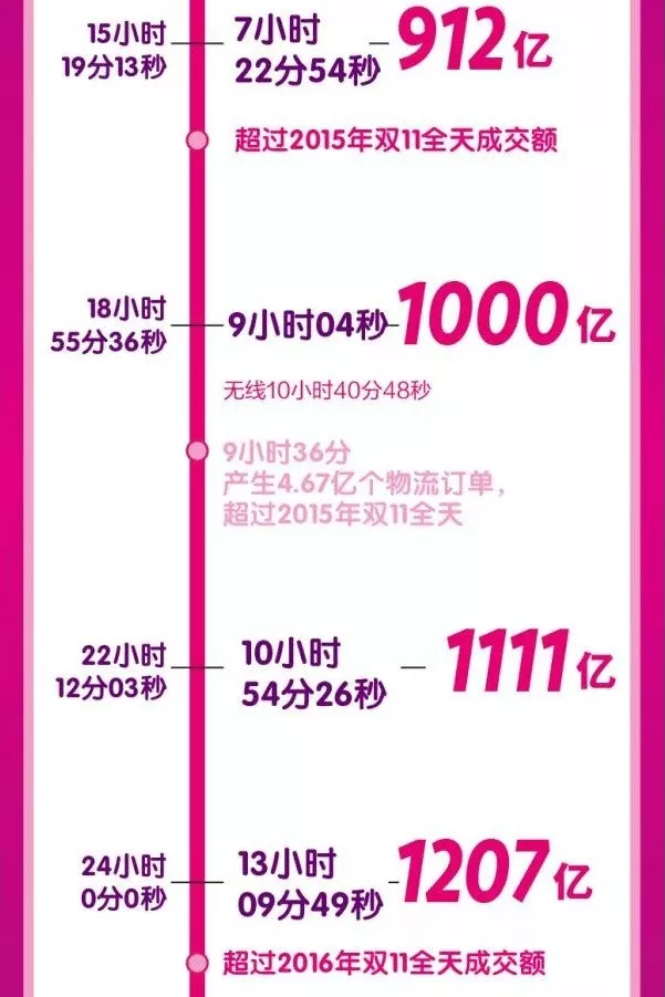 2017天猫双11,全球消费者通过支付宝完成的支付总笔数达到14.8亿笔,比去年增长41%。相当于在双11这一天,平均每个中国人在支付宝上完成超过1笔支付。截至24点,全球225个国家和地区的剁手党加入2017天猫双11全球狂欢节。物流订单达8.12亿!2017天猫双11全球狂欢节共有167个商家当日成交过1亿,17个商家过5亿,6个商家过10亿。