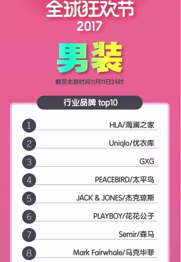 2017天猫双11最终榜单,海澜之家排名男装第一
