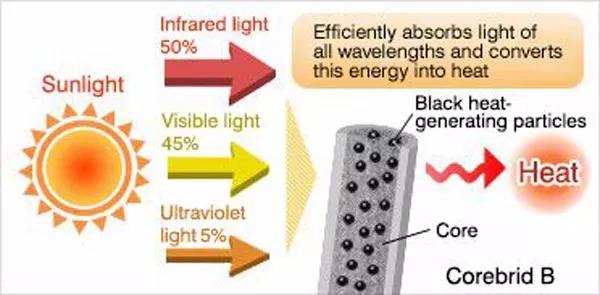 日本尤尼吉可公司的Thermotron纤维芯部溶有碳化锆的微小粒子,在太阳光热能的作用下发出热量并反射出波长较长的远红外线,使服装内部变暖。三菱人造丝公司的无色光热转换聚丙烯腈纤维Thermocatch芯层含有能吸收近红外线的微细半导体粒子(氧化锡与氧化锑的复合物微粉),可将光能转化成热能。当有光照射时,Thermocatch纤维含量在10%以上的混纺纱就可以将光能转化成热能,并提高温度2~10℃。此外,东丽公司的“Torayheat”纤维不仅能吸收可见光并转换成热能,还具有防静电和抗起球的效果。