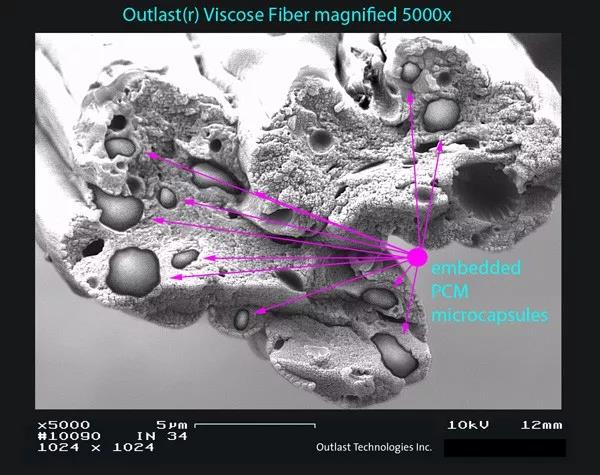 利用物质相态转变时吸收或放出热量的原理,双向调节身体微环境温度。它在环境温度较高时具有吸热功能,在环境温度较低时具有放热功能。美国Outlast技术公司与德国特种纤维制造商Kelheim纤维公司共同研制的Outlast®纤维,就是一种通过相变调节温度的纤维,使用微胶囊包裹热敏相变材料碳氢化蜡,随着温度变化,发生固态、液态的相互转化,从而达到吸热、放热的效果。