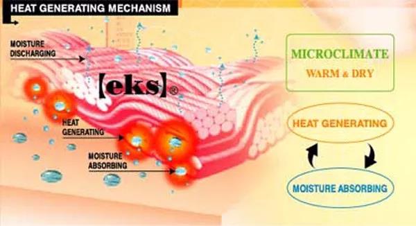 如东洋纺开发的eks纤维,在温度为20℃、相对湿度为65%的条件下吸湿能力是棉的3.5倍,纤维吸放热量约为羊毛的2倍;其开发的N38纤维具有自重41%(20℃、65%相对湿度条件下)吸湿能力,不仅能使衣物内的温度升高约3℃,还具有高吸湿、高放湿能力,同时兼具消臭、抗菌和防霉性能。其他吸湿发热纤维还包括日本东丽公司开发的Softwarm纤维和Warmsensor纤维、日本旭化成株式会社开发的Thermogear纤维、日本三菱公司Renaissα纤维等。