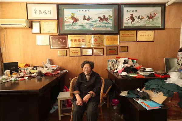 (陈金英坐在已经无人值守的办公室,背后是企业经营多年获得的荣誉)