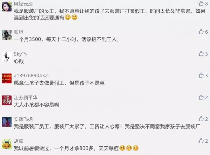工厂招到9位暑假工,2天走了8位,剩下1位说了6个字。你愿意让你的孩子到服装厂去打暑假工吗?