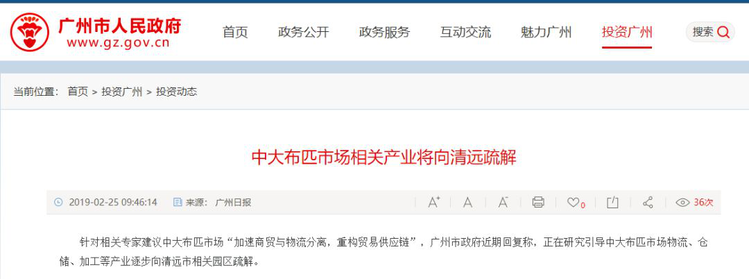 今年2月市政府回复了:中大布匹市场相关产业将向清远疏解。