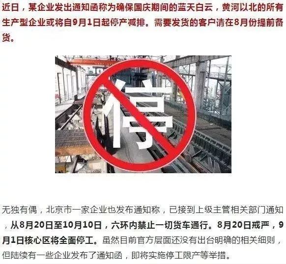 据河北当地某企业负责人介绍,随着国庆临近,目前京津冀周边部分水泥企业已经开始着手制定停产检修计划了。企业负责人表示与2015年相比,今年庆典将更为隆重,而且正值北京秋季空气污染比较严峻的时期。企业有可能需提前做停产减排。