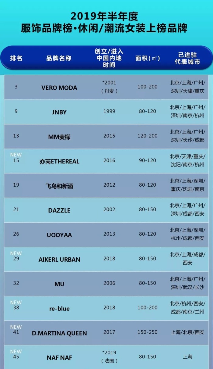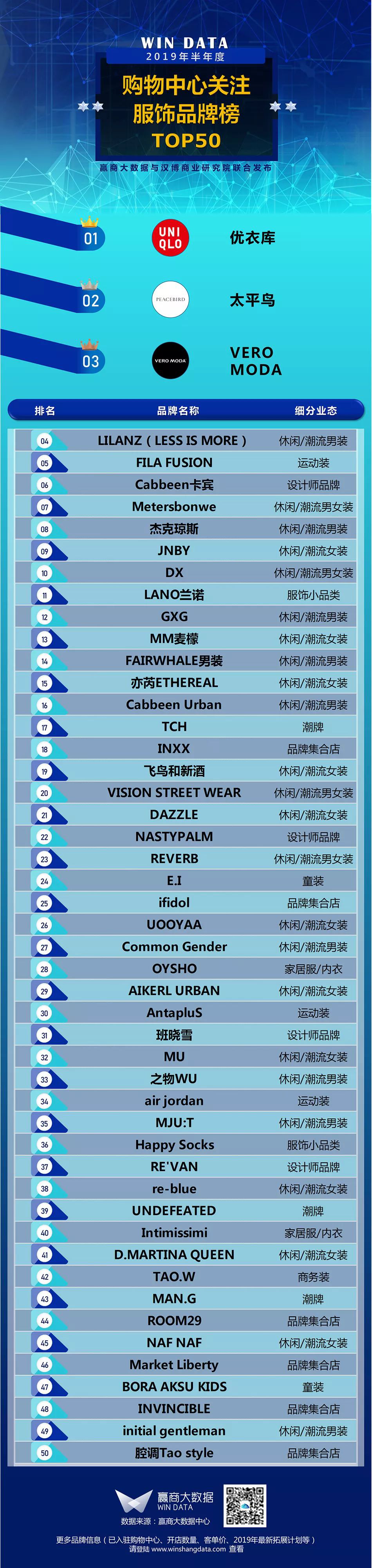 最近赢商大数据公布了——2019半年度购物中心关注服饰品牌榜top50。