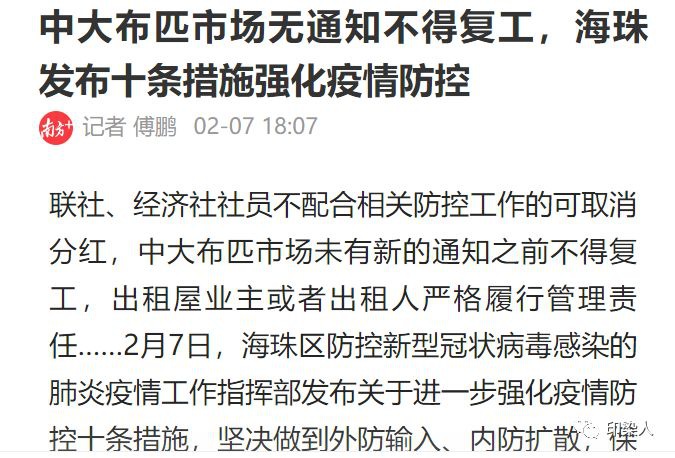 2月7日,记者获悉,联社、经济社社员不配合相关防控工作的可取消分红,中大布匹市场未有新的通知之前不得复工,出租屋业主或者出租人严格履行管理责任...2月7日,海珠区防控新型冠状病毒感染的肺炎疫情工作指挥部发布关于进一步强化疫情防控十条措施,坚决做到外防输入、内防扩散,保障全区居民的健康安全。