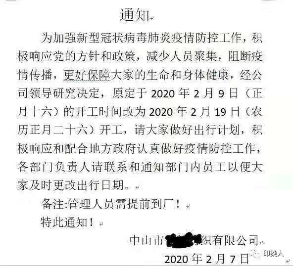 中山市某纺织公司同样在2月7日发布,暂定开工时间为2月19日,请员工做好出行计划。
