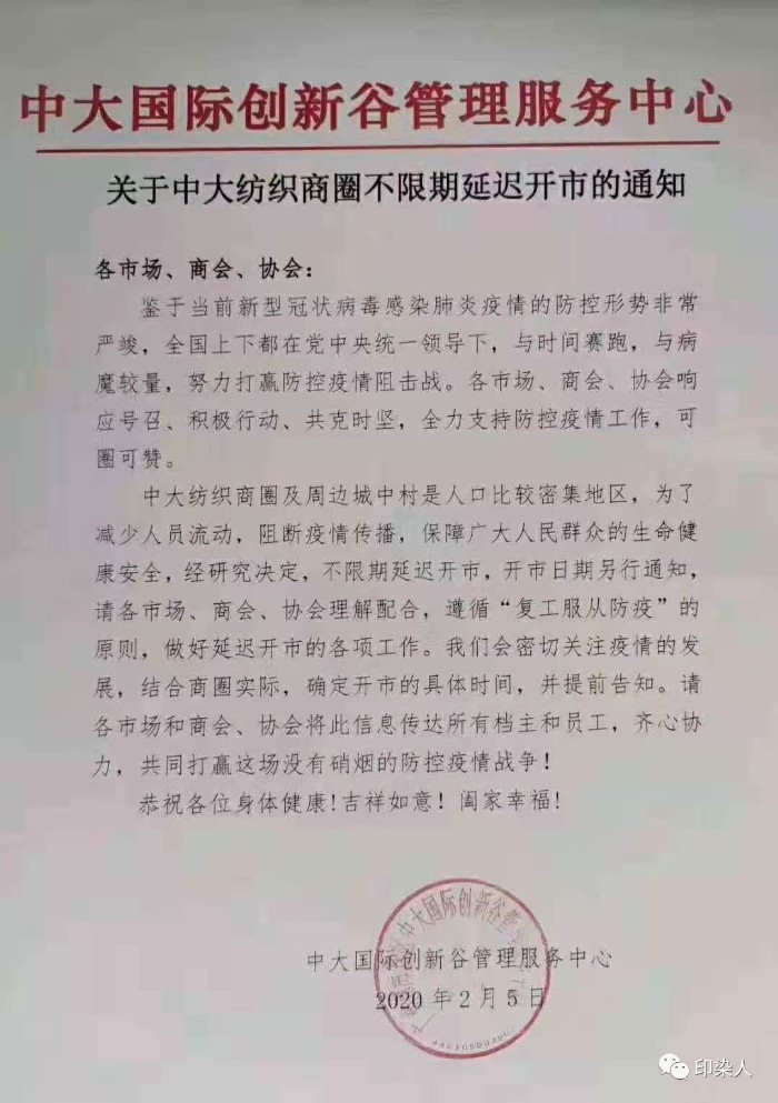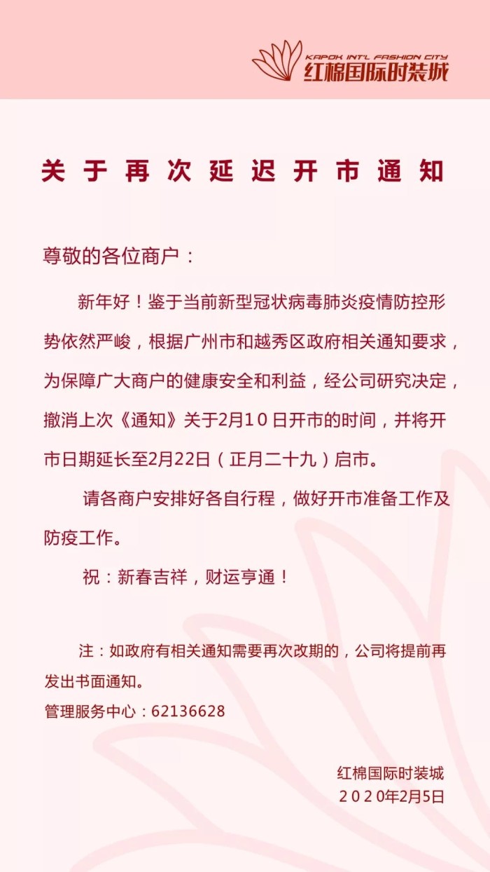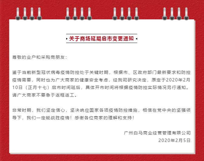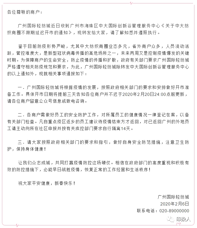 当前新型冠状病毒疫情防控处于关键时期,根据广州市、区政府部门最新要求和防控疫情需要,同时也为广大商家的健康安全考虑,广州中大纺织商圈、广州白马服装市场、红棉国际时装城、广州国际轻纺城、广州轻纺交易园等专业市场发布了延期启市变更通知,坚决响应国家各项疫情防控措施,全力支持防控疫情工作!以下为各大专业市场的延期启市变更通知: