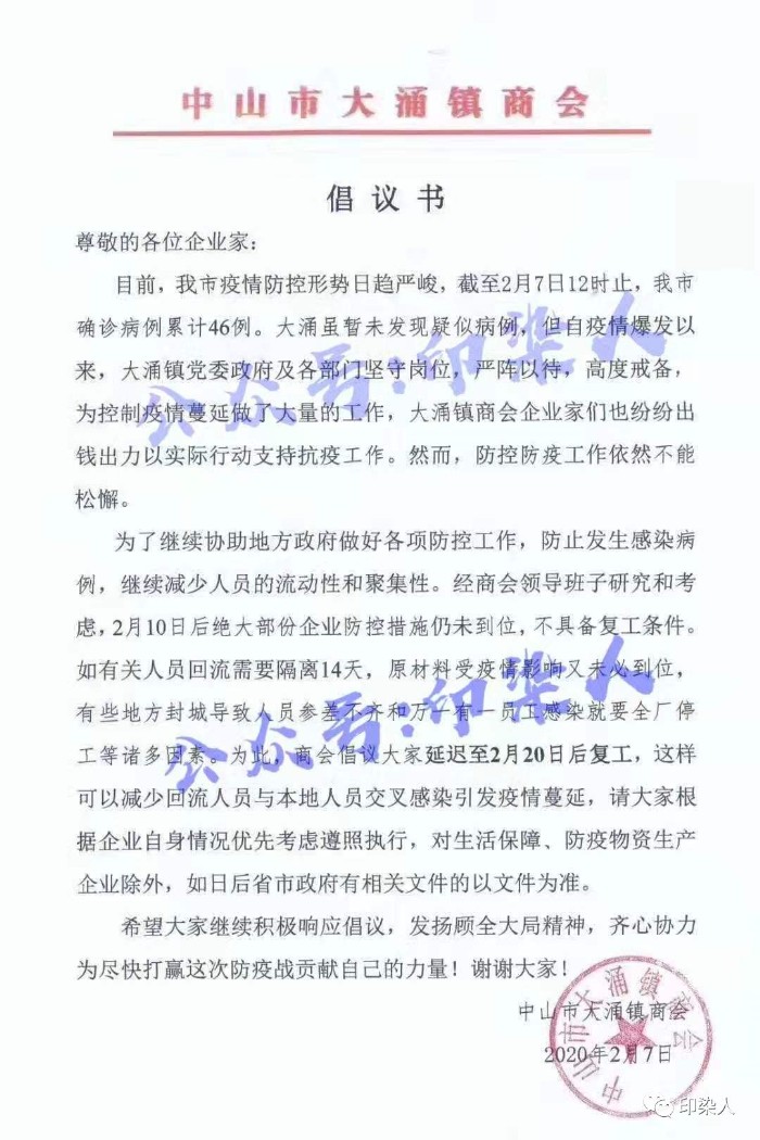 2月7日,中山大涌镇商会经过研究和讨论,考虑到2月10日后绝大部分企业防控措施仍未到位,不具备复工条件,同时考虑到有关人员回流回来仍需要隔离14天,以及原材料未必到位等因素,大涌镇商会倡议各企业复工日期定在2月20日之后。