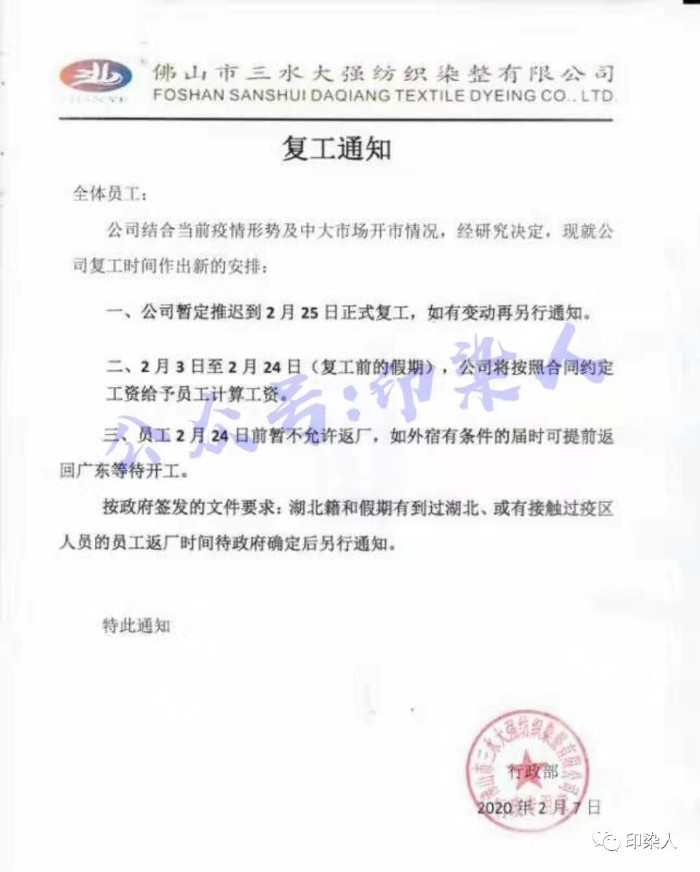 2月7日,佛山市三水大强纺织染整有限公司发出《复工通知》,在通知中暂定2月25日正式复工,如有变动另行通知。