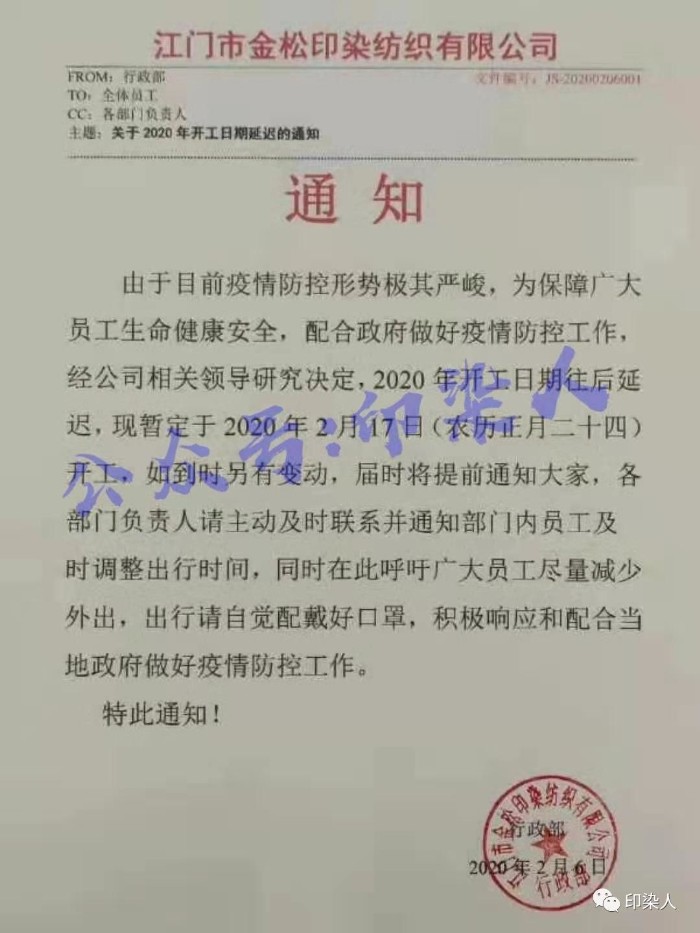 2月6日,江门市金松印染纺织有限公司发布通知,为做好防控工作,暂定2月17日复工。