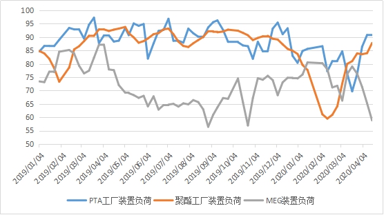 但同时我们也看到一个不合理的地方就是上下游的负荷出现了背离。今年原本就是聚酯及上游产能投放的高峰期,恰逢遇到疫情导致终端需求大幅度萎缩,聚酯及上游的整体社会库存势必大幅度积累。但从负荷看,对比终端需求的大幅度萎缩以及下游织造端的开机大幅下降,上游供应端收缩却并不明显,这样反而导致聚酯产业链的库存积累速度在加快。从4月份来看,聚酯负荷稳中有升,PTA负荷节节攀升,PX负荷也不低,MEG虽然4月份有几套装置例行检修以及镇海炼化的意外停车导致负荷大幅度下降,但由于年初浙江石化和恒力炼化两套大装置投产,导致MEG社会库存依旧不断上升。据本网统计,预计到4月底,PTA社会库存达到400万吨,MEG社会库存也将靠近300万吨。