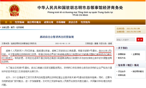 越南《人民报网》1月5日报道,据越通社报道,越南工贸部进出口局透露,根据该部第9号通知,自2021年1月1日起,对于暂进再出货物和转口贸易,若通过陆地边界进口到越南或再出口到国外时只能通过国际口岸和双边口岸正式口岸进行。特别的是,该规定也适用于通过陆地边境进口到越南或再出口到国外并存放在保税仓库中的外国暂进再出货物。
