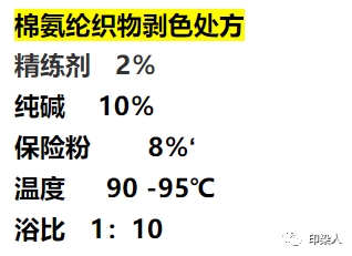 棉织物剥色一般采用保险粉-烧碱法,而对于棉氨纶织物来说,由于其中含有3%~5%的氨纶纤维,氨纶不耐强碱,尤其在高温条件下,烧碱对氨纶起分解作用,故棉氨纶织物整理加工需尽量降低烧碱浓度,且温度不宜过高。生产中常常采用纯碱代替烧碱,由于碱性较弱,对氨纶作用较为缓和。