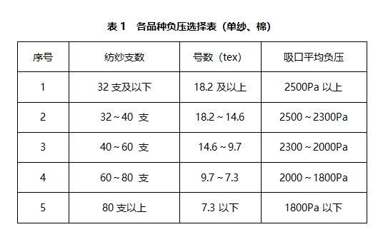 用户可根据自己的纺纱品种及纺纱支数或号数通过下表选择相对应的异形管槽口负压值。若纺混纺或化纤产品,可适当选择对应较高的负压(一般在2300-1700Pa范围)。具体最佳负压值是根据各公司的实际情况通过实验确定的。