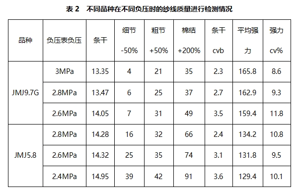 表2是对不同品种在不同负压时的纱线质量测试情况: