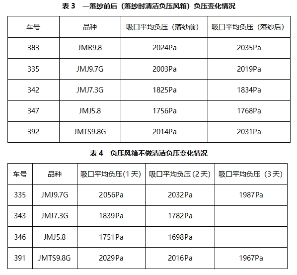 负压管负压大小是影响紧密纺纱线质量的关键因素,而车尾负压风箱内的积花是影响异型管负压大小的主要原因,如果不及时清洁负压风箱内积花,将会引起异型管负压值下降影响纱线质量稳定。下表是一落纱前后(落纱时清洁负压风箱)负压变化情况和负压风箱不做清洁时负压变化情况。