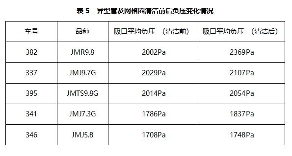 由上表可见,异型管接头老化变形对异型管吸口负压也有较大的影响,平扫车拆下异型管清洁时要注意检查异型管接头的硬化变形情况,发现不良接头及时更换。