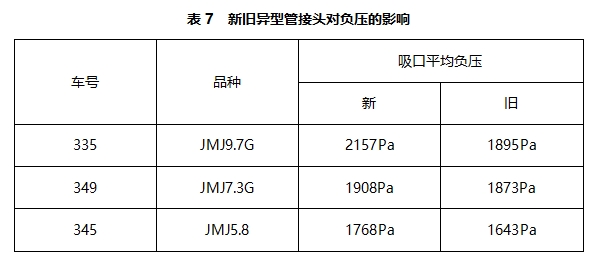 表7是新旧异型管接头对异型管吸口负压大小的影响。