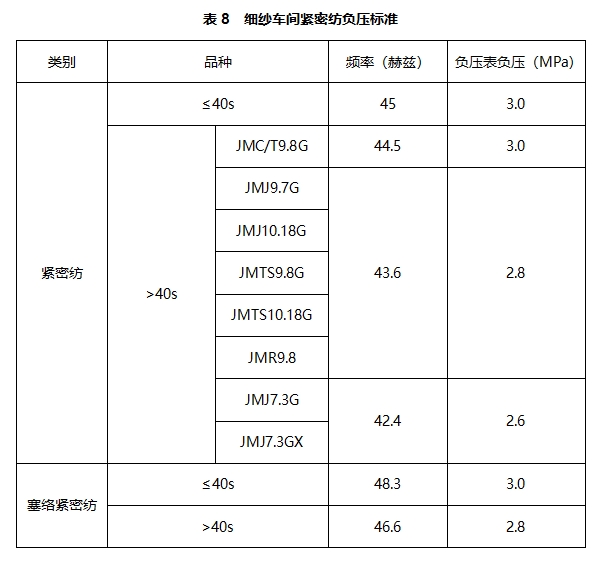 通过以上对影响紧密纺负压值因素的分析及采取相应的措施,在紧密纺负压表灵敏度不高的情况下,为保证同品种紧密纺负压值的相对稳定统一,应以控制负压风机转速的频率为标准,车头负压表显示的负压值仅可作为参考,同时定期检查负压风机转速及异型管吸口负压变化情况。经过实验对比,我公司对各品种负压做如下规定:表8(负压表负压单位:Kpa)