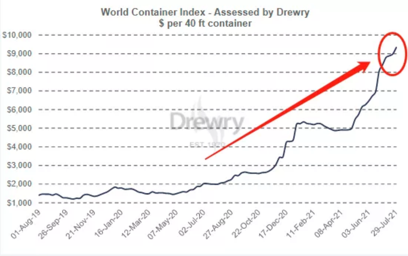 Drewry本期的世界集装箱综合指数(WCI)上涨4%即344美元,达到每40英尺集装箱9330.28美元,比2020年同期上涨368%。