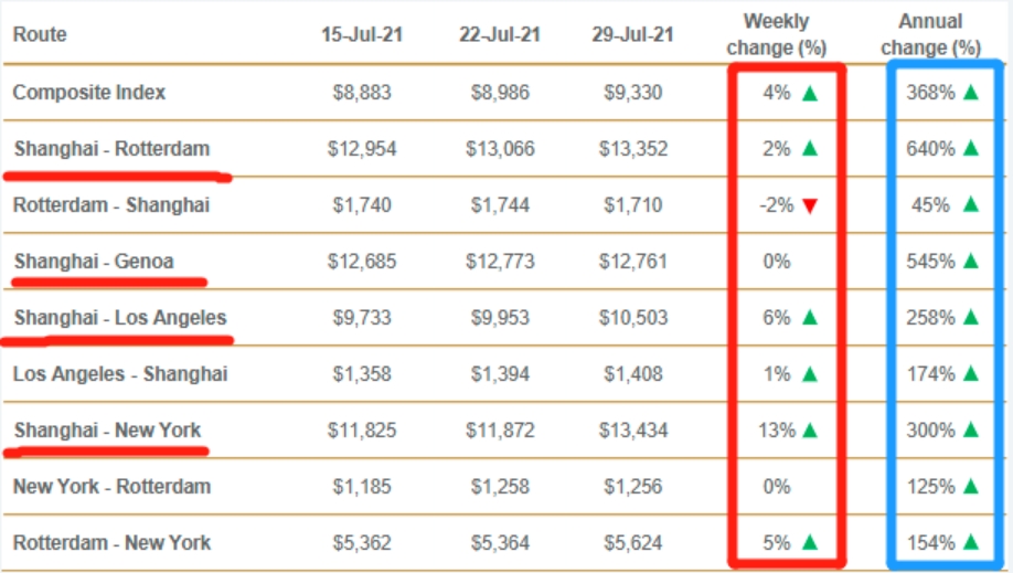 ·上海-纽约的运费本周飙升1562美元涨幅达13%,运价突破1.3万美元达到13434美元/40英尺集装箱,比2020年同期上涨300%。